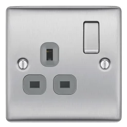 British General Nexus Metal 13A 1-Gang SP Switched Plug Socket Brushed Steel With Graphite Inserts