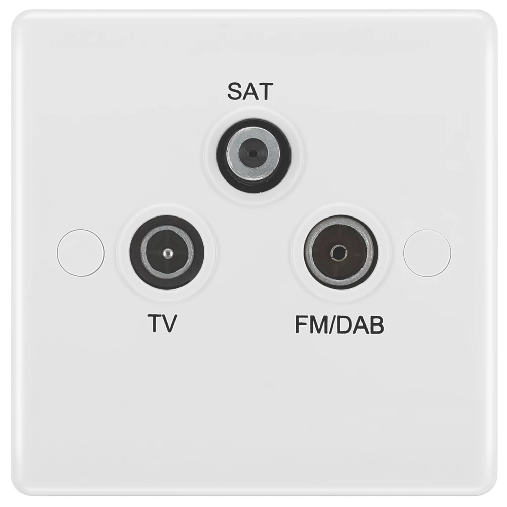 Provides outlets for TV, FM and satellite. Metal housing helps stop RF leakage and signal loss as well as protecting against impulse noise and EMI/RF interference. Moulded front-plate manufactured from thermoset urea, with inherent anti-microbial properties. Finished with softly rounded edges and screw caps.