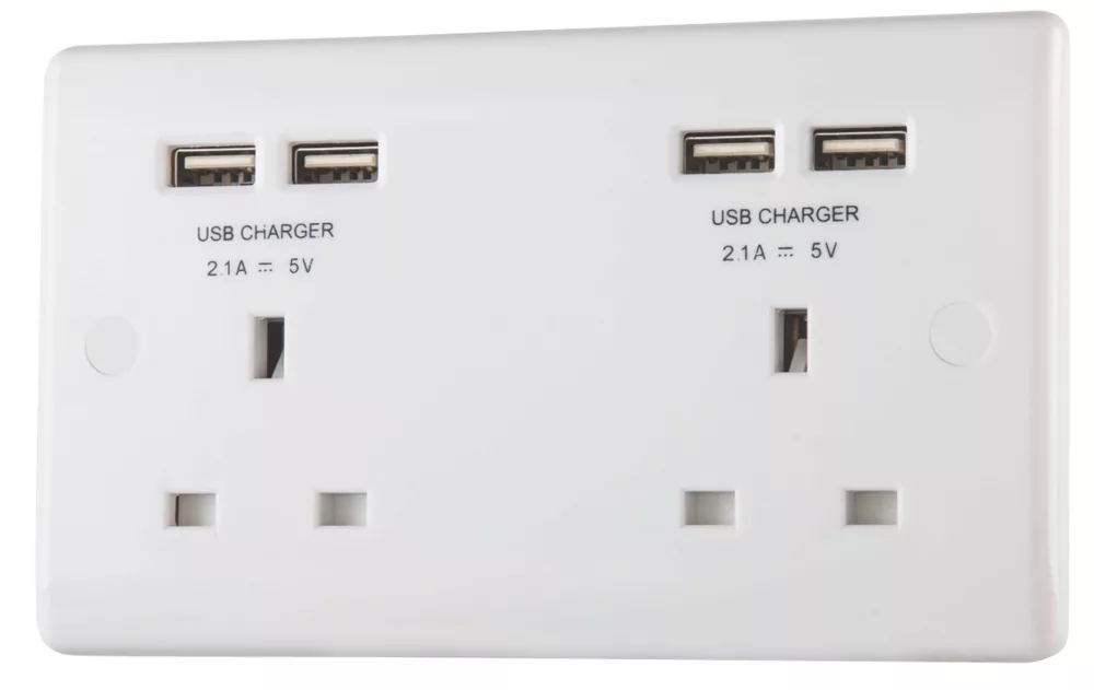 White moulded socket with 4 USB charging ports. Ideal for mobile phones, tablets and other USB devices. Features protective overload function.