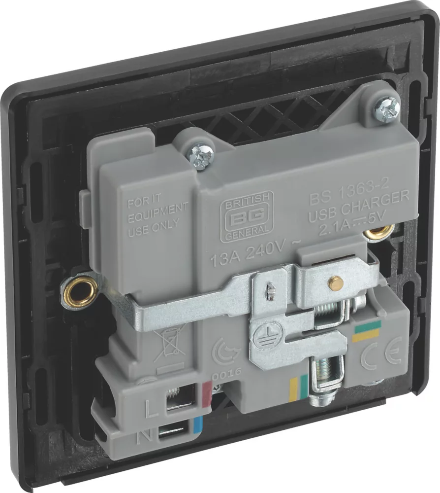 Single power socket with 2 USB charging ports. Offers ability to charge mobile devices without using extra sockets. Auto-detects USB device and adjusts charging pattern to suit, switching to standby mode when fully charged to prevent overload. Features low profile, screwless flat plate that clips on and off, making it ideal for modern interiors.