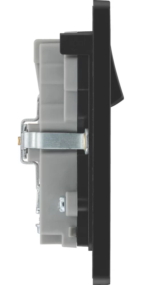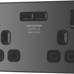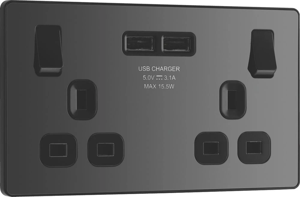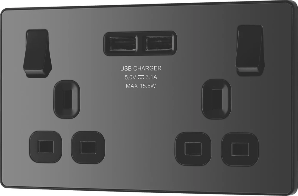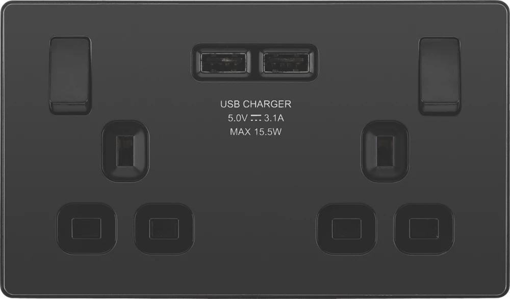 Double power socket with 2 USB charging ports. Offers ability to charge mobile devices without using extra power sockets. Auto-detects USB device and adjusts charging pattern to suit, switching to standby mode when fully charged to prevent overload. Features low profile, screwless flat plate that clips on and off, making it ideal for modern interiors. Suitable for retro-fit to 35mm back box.