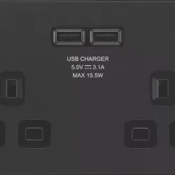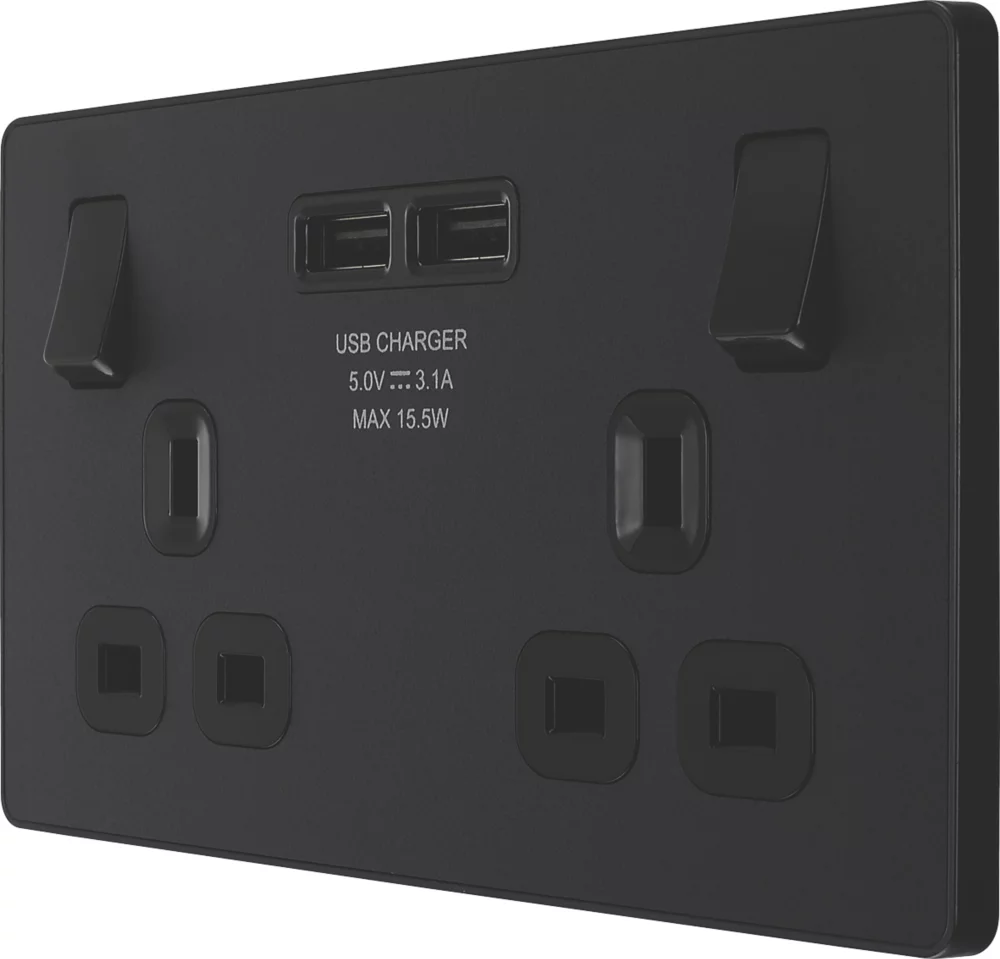 Double power socket with 2 USB charging ports. Offers ability to charge mobile devices without using extra power sockets. Auto-detects USB device and adjusts charging pattern to suit, switching to standby mode when fully charged to prevent overload. Features low profile, screwless flat plate that clips on and off, making it ideal for modern interiors. Suitable for retro-fit to 35mm back box.