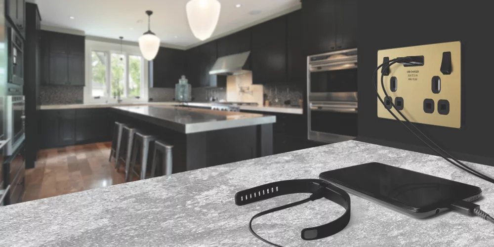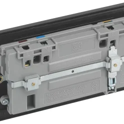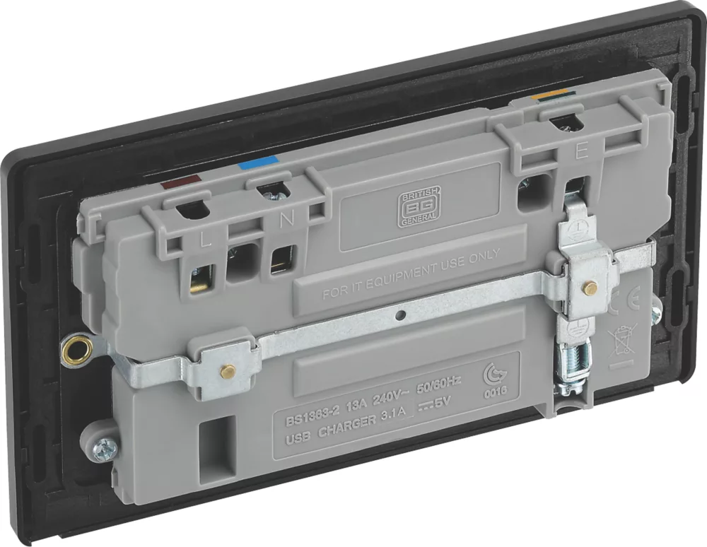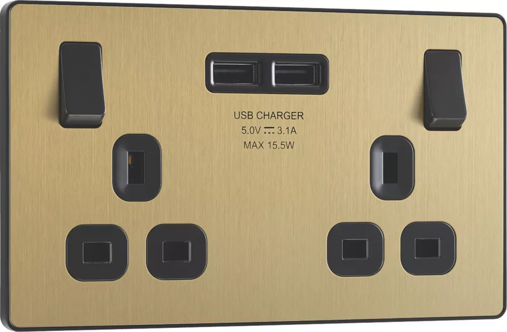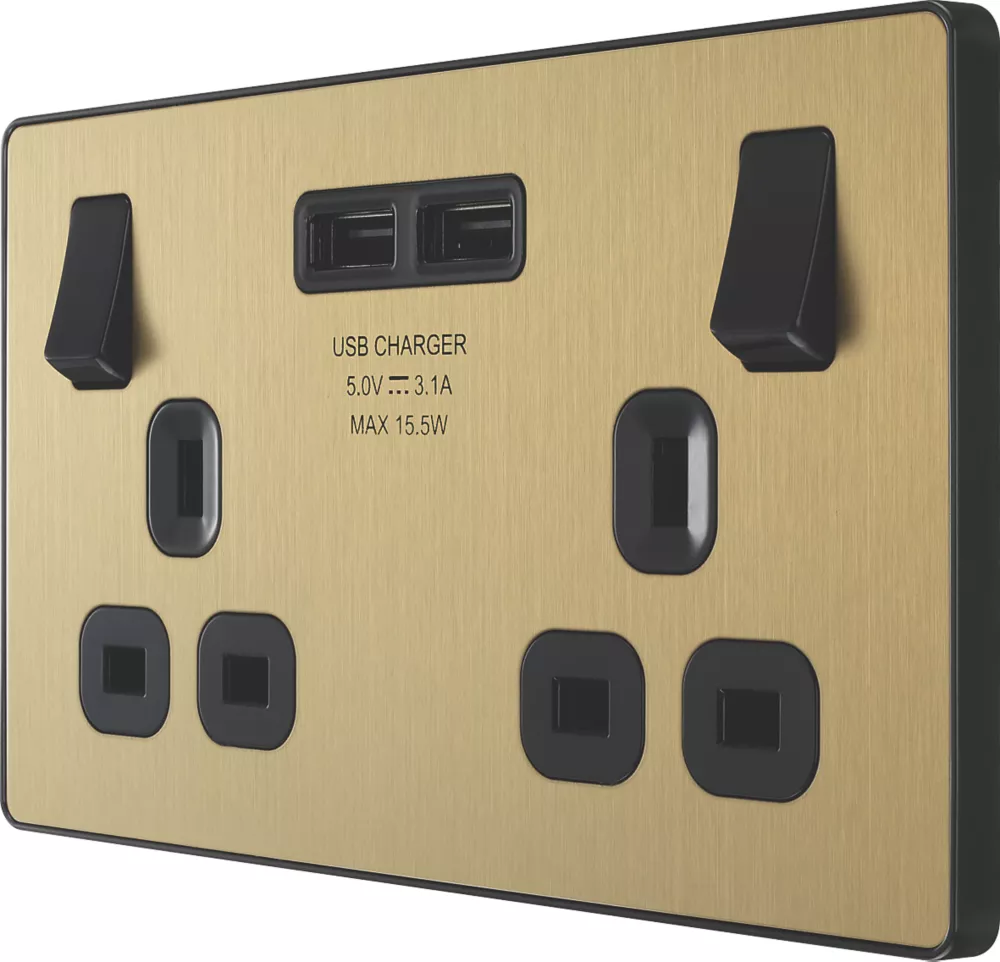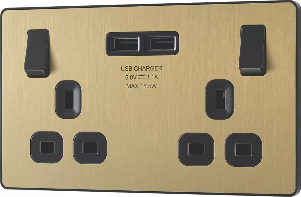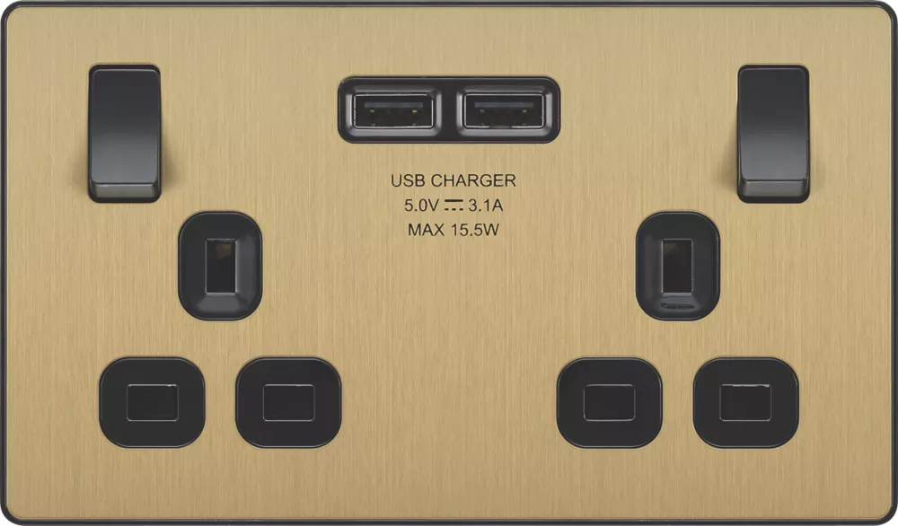 British General Evolve 13A 2-Gang SP Switched Socket + 3.1A 2-Outlet Type A USB Charger Satin Brass With Black Inserts