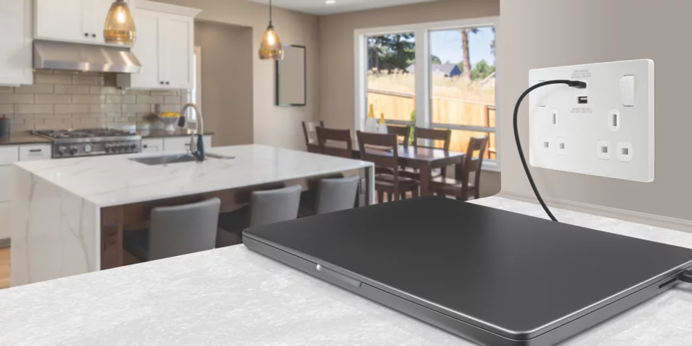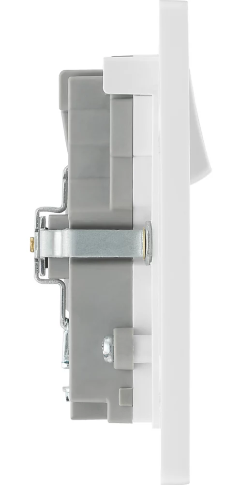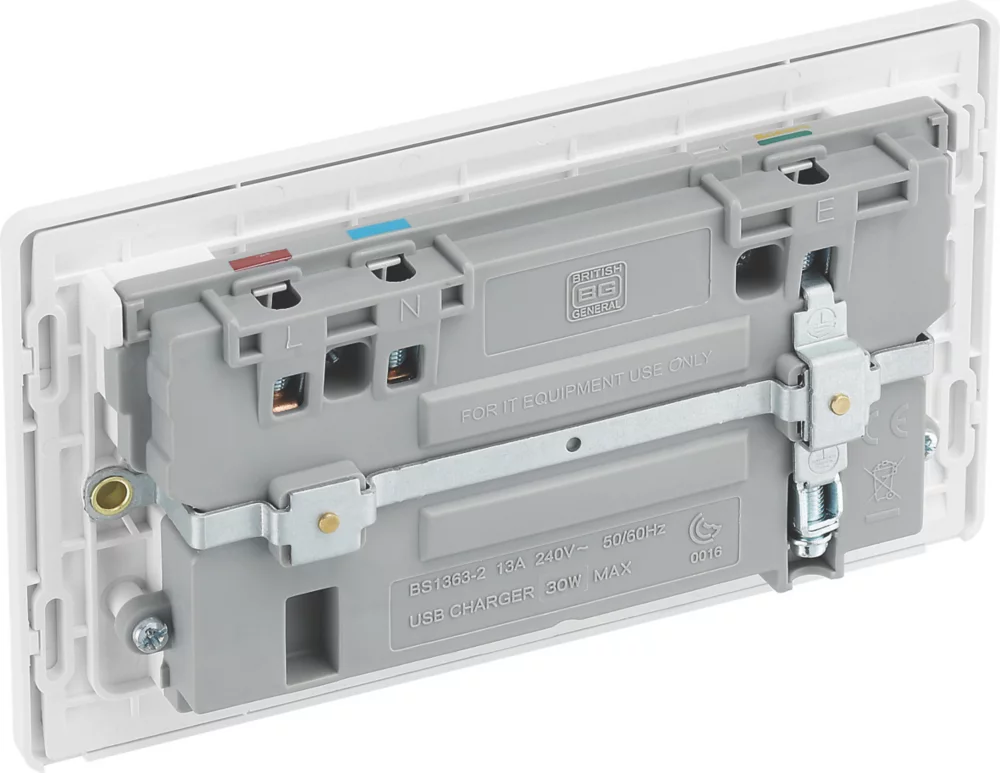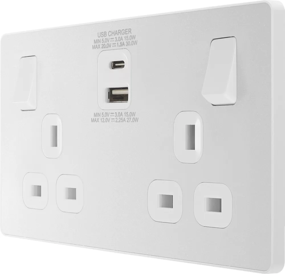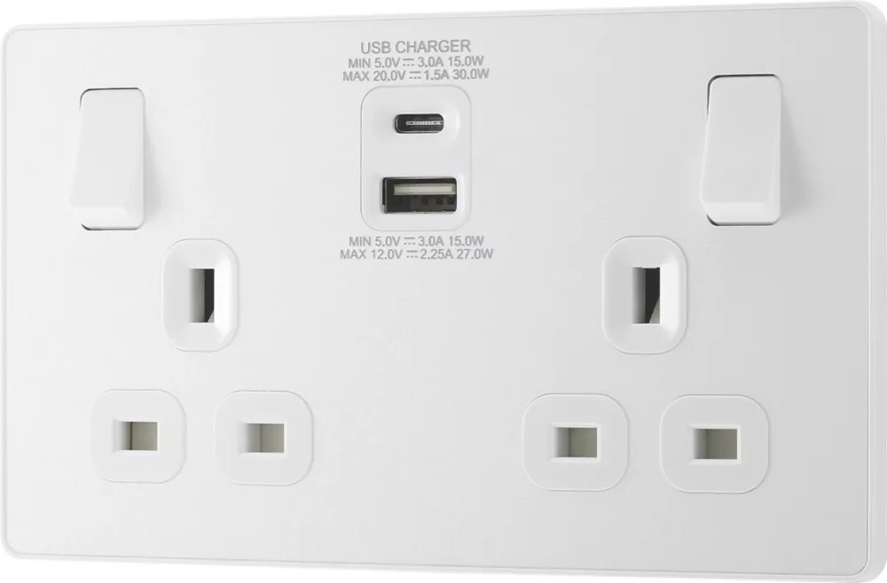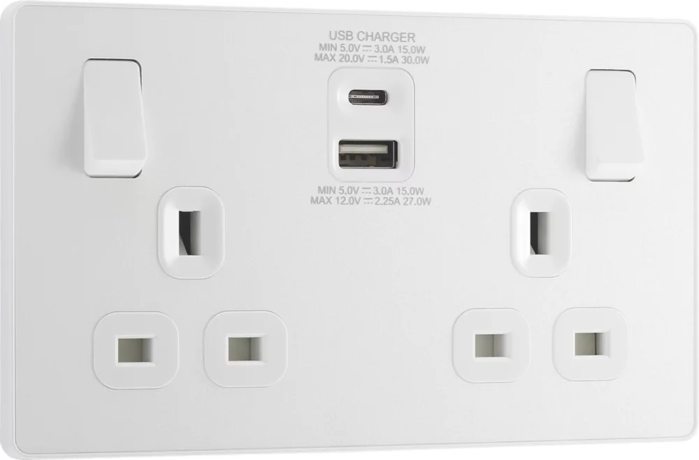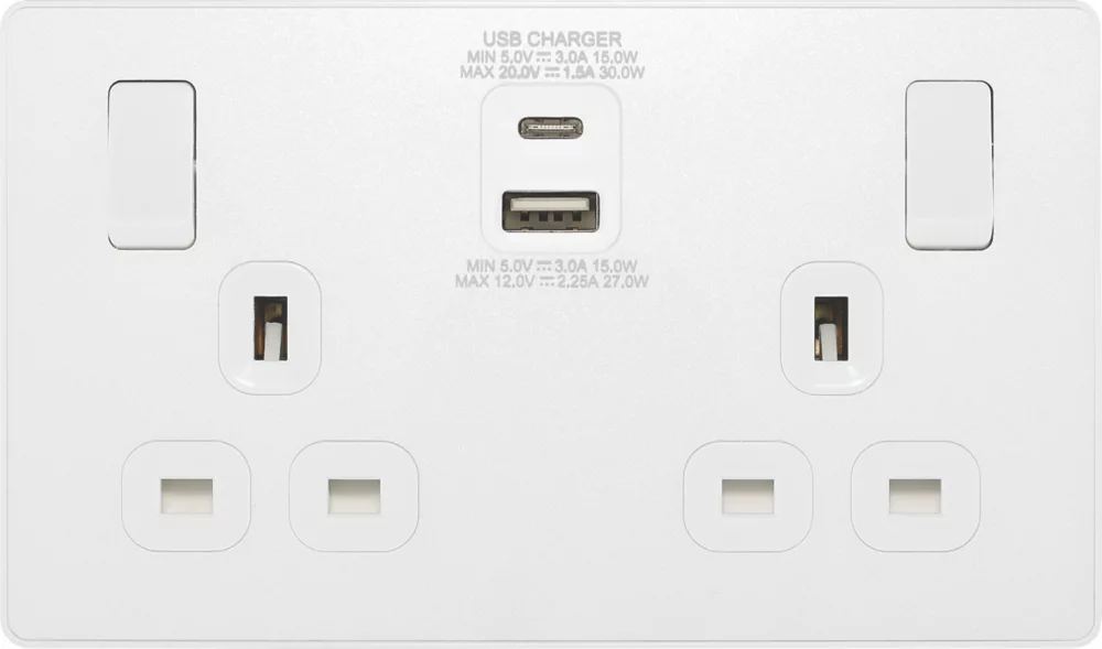 Power socket with integrated fast charge USB-A and USB-C ports, allowing devices to be charged without use of adaptors. Smart charging adjusts voltage to provide required power without overcharging. Delivers 50% charge to mobile phones in 30 minutes and charges up to 70% faster than standard 5V charging. Features low profile, screwless flat plate that clips on and off, making it ideal for modern interiors. Suitable for retro-fit to existing 35mm back box.