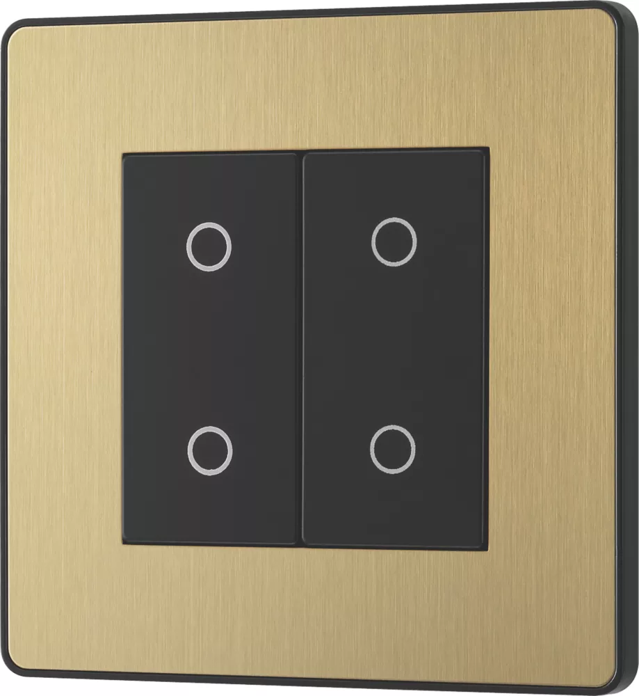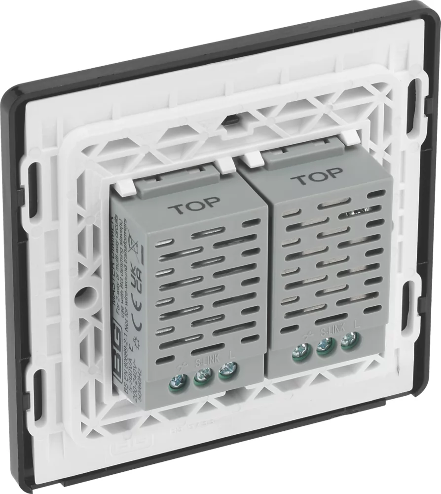 Evolve double master trailing edge touch dimmer switch that controls light levels and sets mood. Intelligent electronic circuit monitors the connected load and provides a soft-start with protection against thermal, current and voltage overload. Suitable for dimming LED, dimmable CFLs and traditional lighting. Soft-start brings the lights to a set level in around 1 second and extends lamp life. Silent operation means no noise when dimming, while support for low wattage lamps eliminates flicker. Low profile screwless flat plate that clips on and off, ideal for modern interiors.