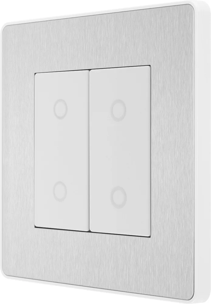 Evolve double secondary touch dimmer switch that controls light levels and sets mood. Must be in the same circuit as a master touch dimmer. Intelligent electronic circuit monitors the connected load and provides a soft-start with protection against thermal, current and voltage overload. Suitable for dimming LED, dimmable CFLs and traditional lighting. Soft-start brings the lights to a set level in around 1 second and extends lamp life. Silent operation means no noise when dimming, while support for low wattage lamps eliminates flicker. Low profile screwless flat plate that clips on and off, ideal for modern interiors.