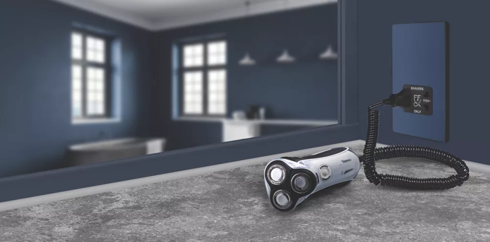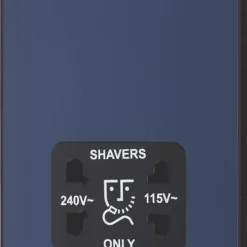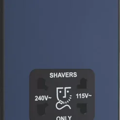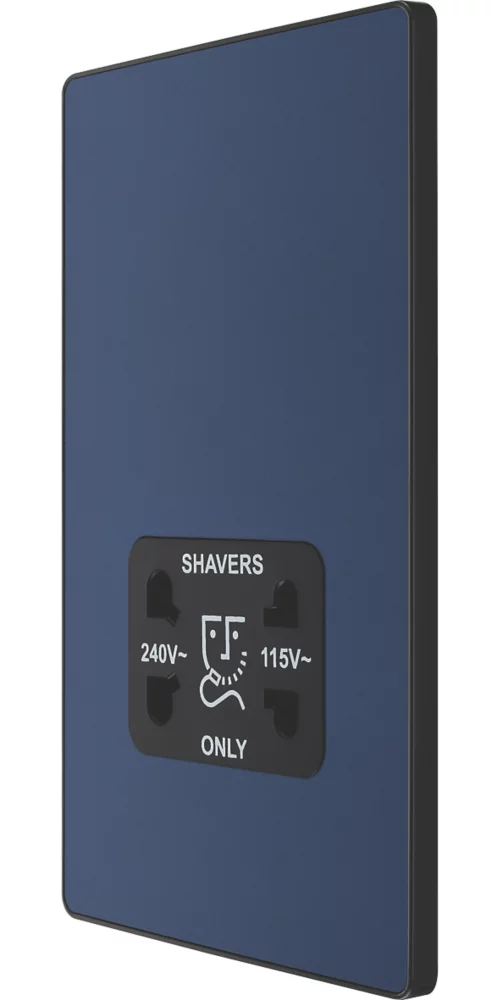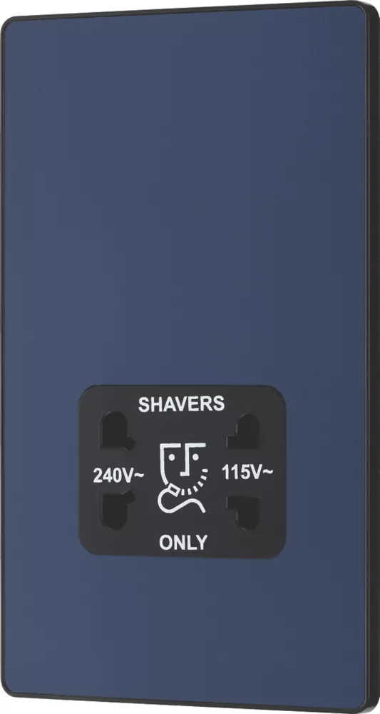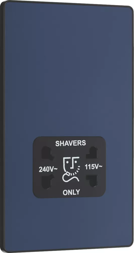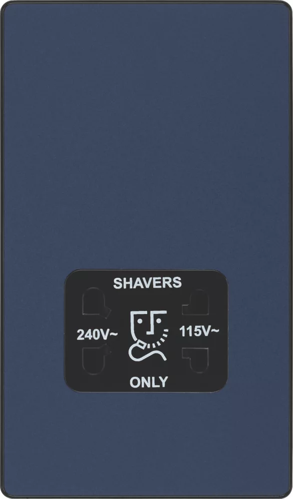 Matt blue, dual voltage shaver socket, suitable for use with both 240V and 115V shavers and electric toothbrushes. Low profile screwless flat plate clips on and off, making it ideal for modern interiors. Easy to install, with captive, backed out terminal screws to prevent screw loss.