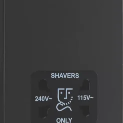 Matt black, dual voltage shaver socket, suitable for use with both 240V and 115V shavers and electric toothbrushes. Low profile screwless flat plate clips on and off, making it ideal for modern interiors. Easy to install, with captive, backed out terminal screws to prevent screw loss.