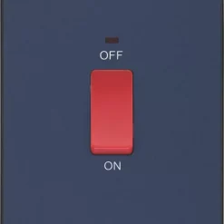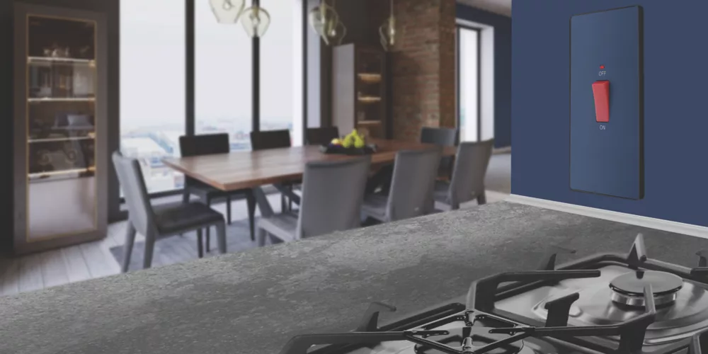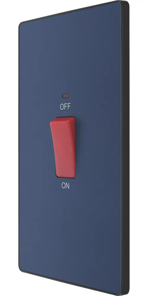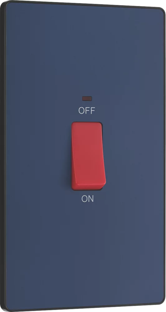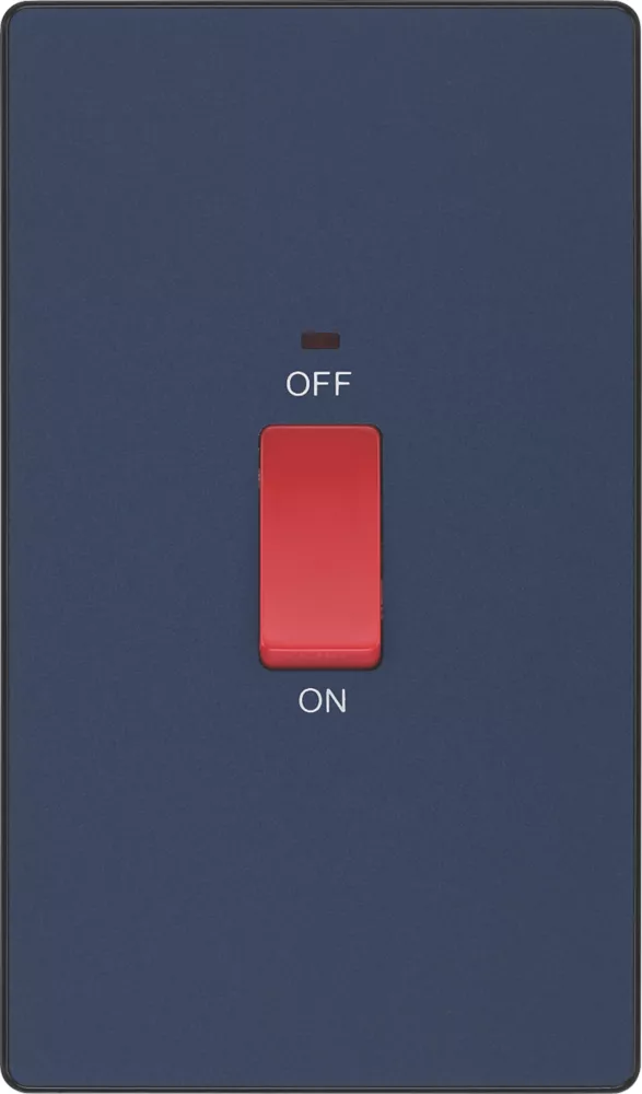 Double pole switch with low power, flush fit LED indicator, for use with cookers and ovens. Features large mounting plate (146mm x 86mm) and low profile, screwless flat plate that clips on and off, making it ideal for modern interiors.