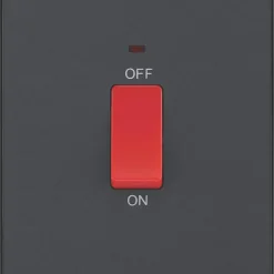 Double pole switch with low power, flush fit LED indicator, for use with cookers and ovens. Features large mounting plate (146mm x 86mm) and low profile, screwless flat plate that clips on and off, making it ideal for modern interiors.