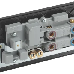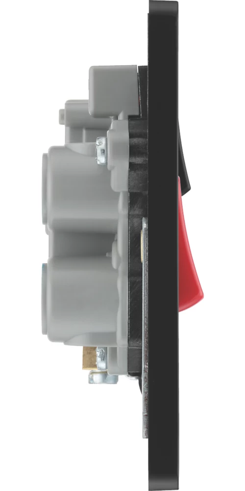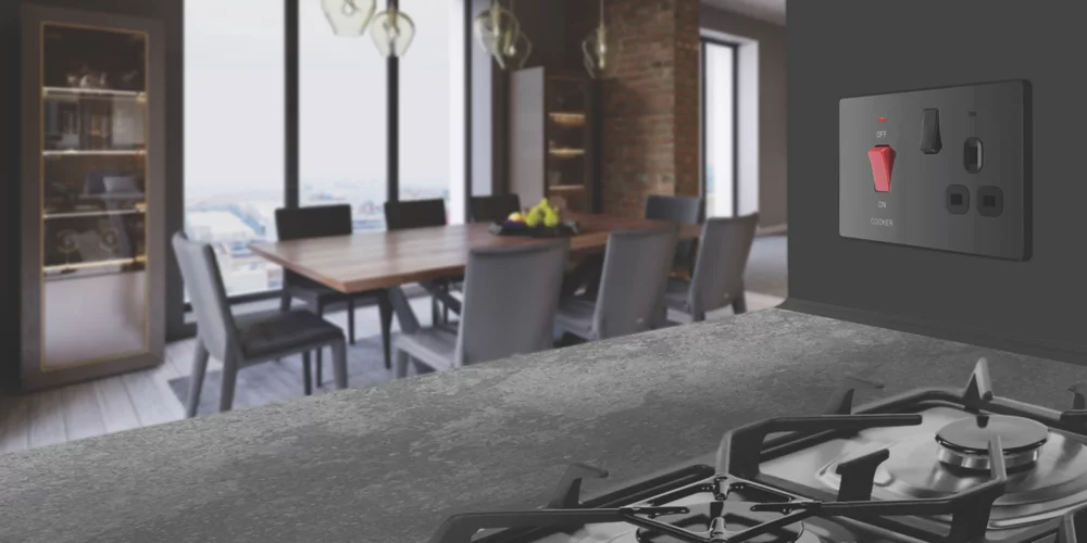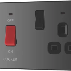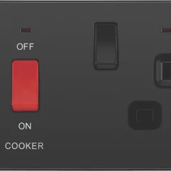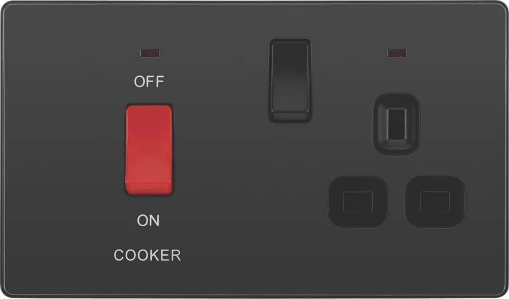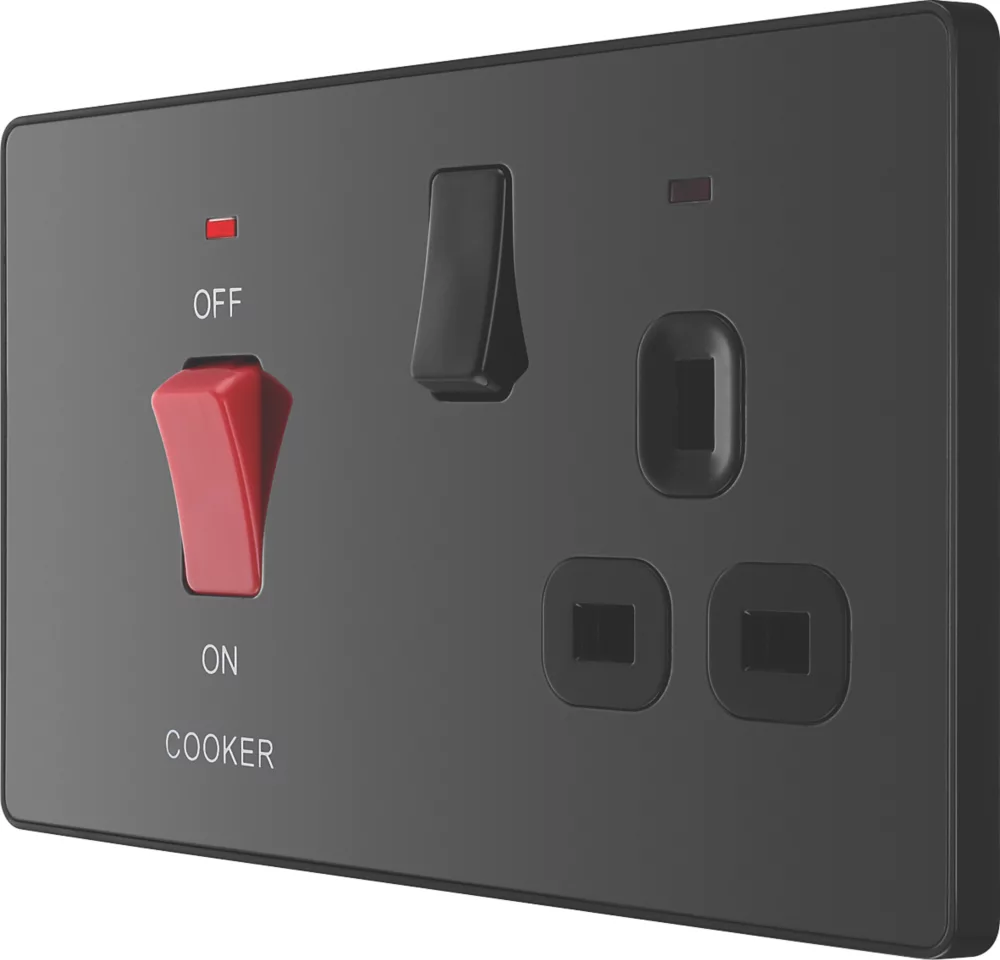 Cooker control unit with 13A socket for additional appliance outlet. Features flush LED indicators above socket and switch and low profile, screwless flat plate that clips on and off, making it ideal for modern interiors.