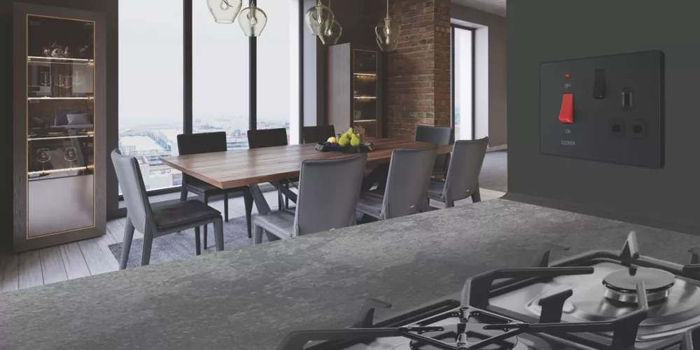 Cooker control unit with 13A socket for additional appliance outlet. Features flush LED indicators above socket and switch and low profile, screwless flat plate that clips on and off, making it ideal for modern interiors.