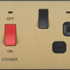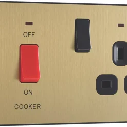 Cooker control unit with 13A socket for additional appliance outlet. Features flush LED indicators above socket and switch and low profile, screwless flat plate that clips on and off, making it ideal for modern interiors.