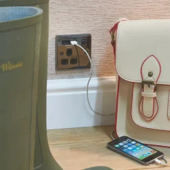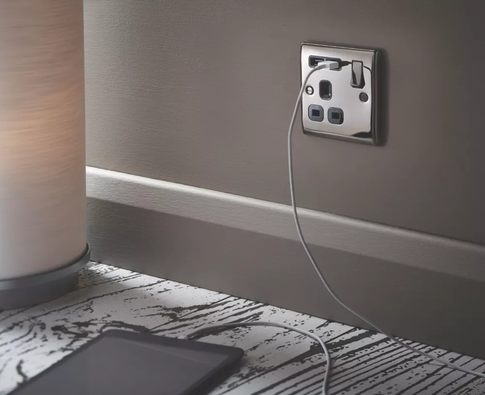 Decorative finish switched socket with 2 USB charging ports. Sleek and slim design with softly rounded corners. Features angled, in-line terminals and includes backed out captive screws for easy installation. Ideal for charging iPads, iPhones, tablets, mobiles, cameras and more.