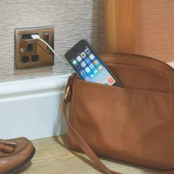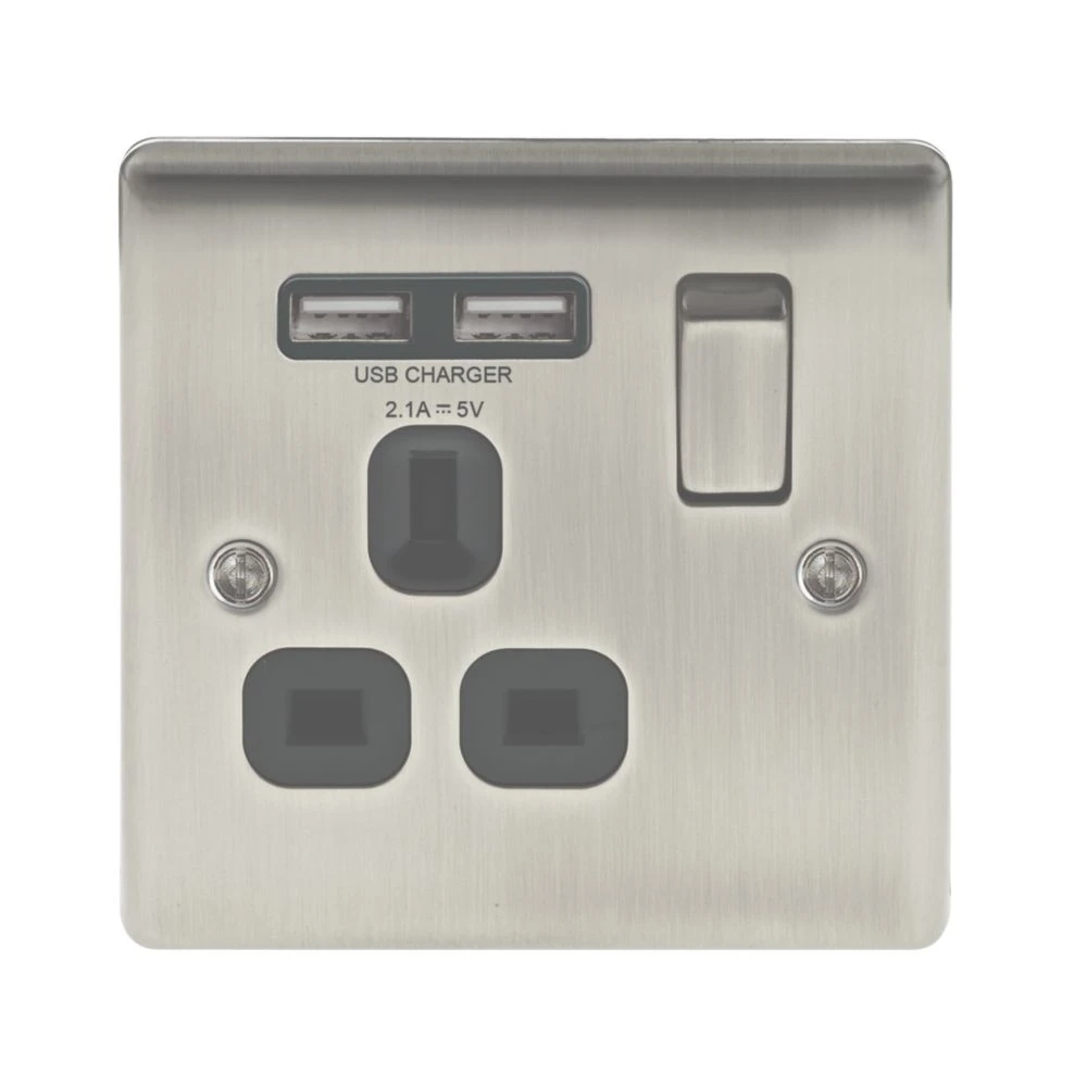 Decorative finish switched socket with 2 USB charging ports. Sleek and slim design with softly rounded corners. Features angled, in-line terminals and includes backed out captive screws for easy installation. Ideal for charging iPads, iPhones, tablets, mobiles, cameras and more.