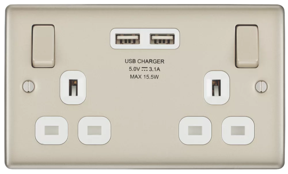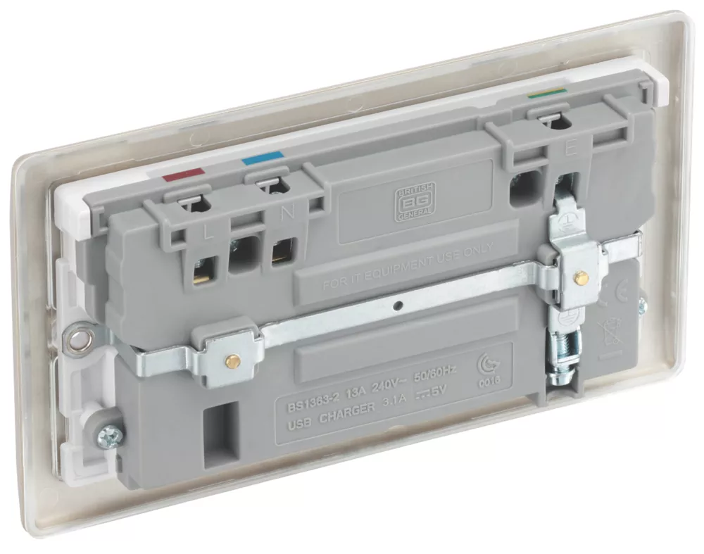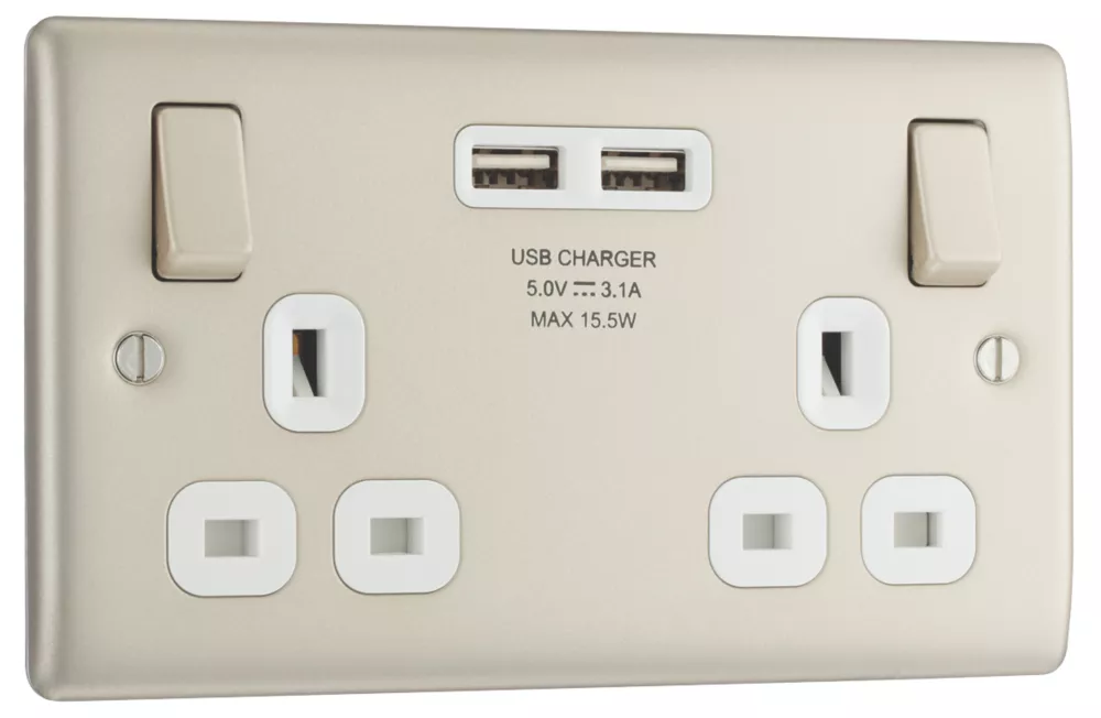 Double power socket with 2 USB charging ports. Offers ability to charge mobile devices without using extra power sockets. Auto-detects USB device and adjusts charging pattern to suit, switching to standby mode when fully charged to prevent overload. Features slim profile with rounded edges and moisture control gasket to prevent tarnishing from new plaster.