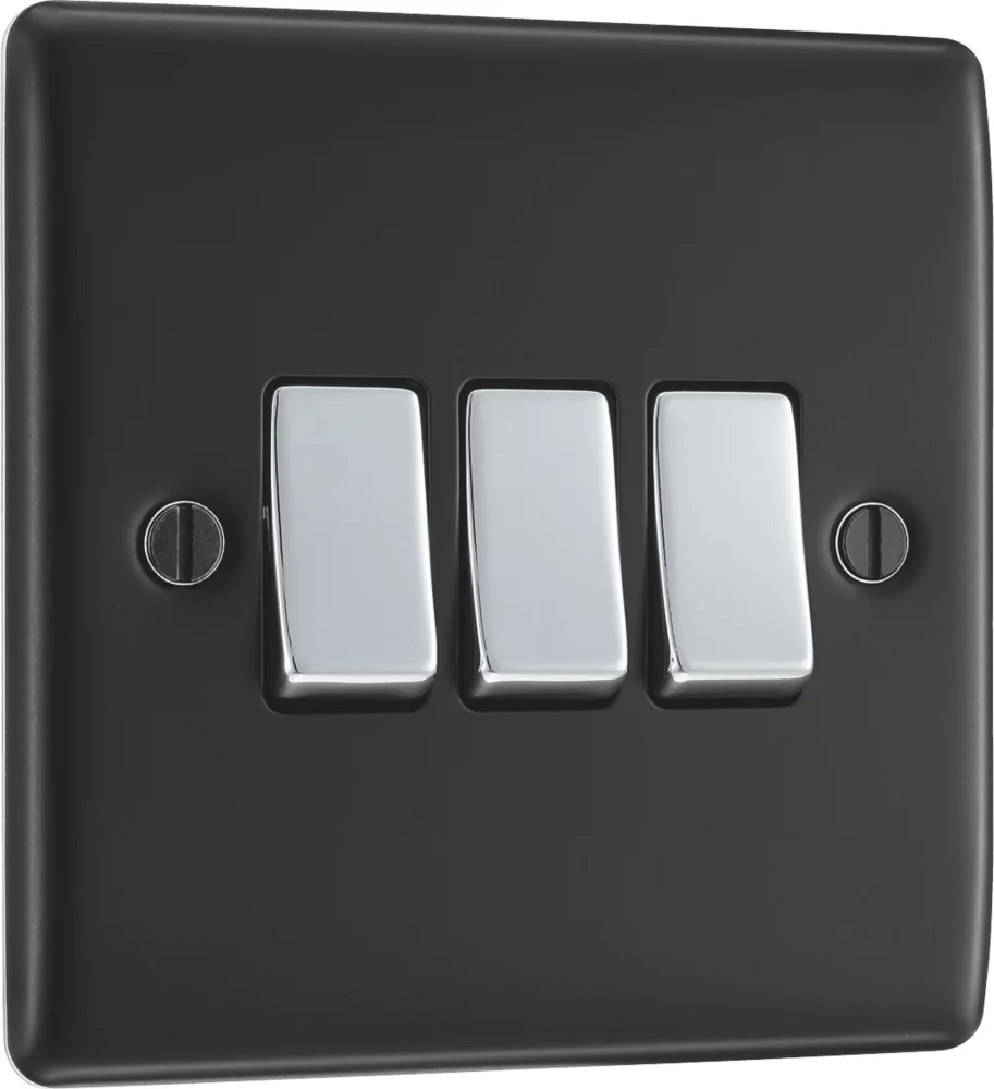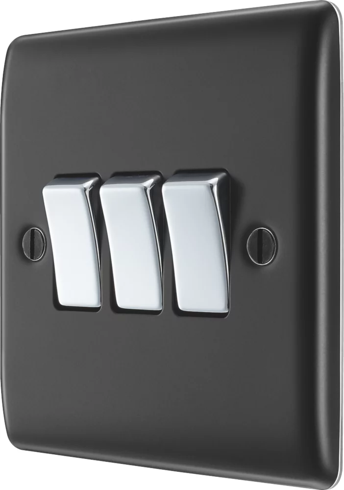 Raised, slim profile. Allows operation of 3 different lights, plus the addition to the circuit of a 2nd switch, to operate the same light from another location (e.g. at the top and bottom of the stairs). Features moisture control gasket, to prevent tarnishing from new plaster.