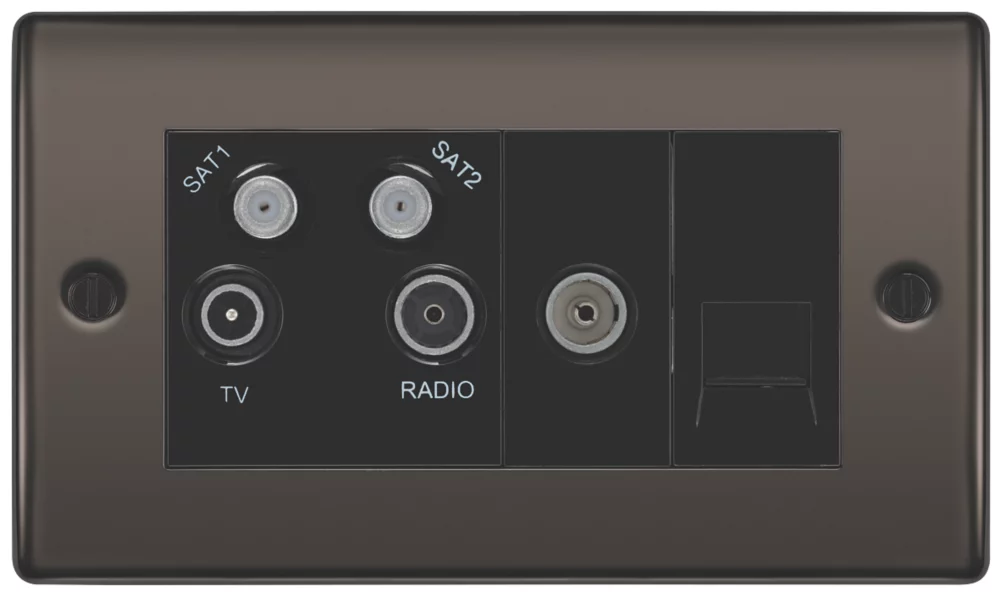 Provides outlets for TV, FM and 2 satellite, plus return and shuttered telephone socket. Metal housing helps stop RF leakage and signal loss as well as protecting against impulse noise and EMI/RF interference. Features moisture control gasket to prevent tarnishing from new plaster. Sleek, slim profile with softly rounded edges.