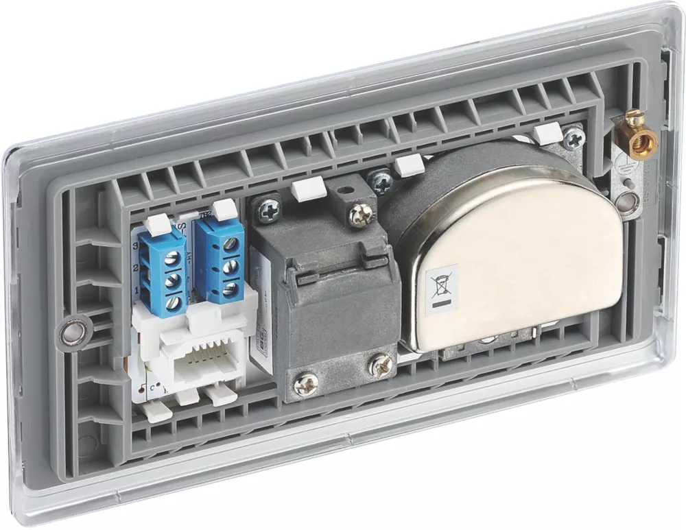 Provides outlets for TV, FM and 2 satellite, plus return and shuttered telephone socket. Metal housing helps stop RF leakage and signal loss as well as protecting against impulse noise and EMI/RF interference. Features moisture control gasket to prevent tarnishing from new plaster. Sleek, slim profile with softly rounded edges.