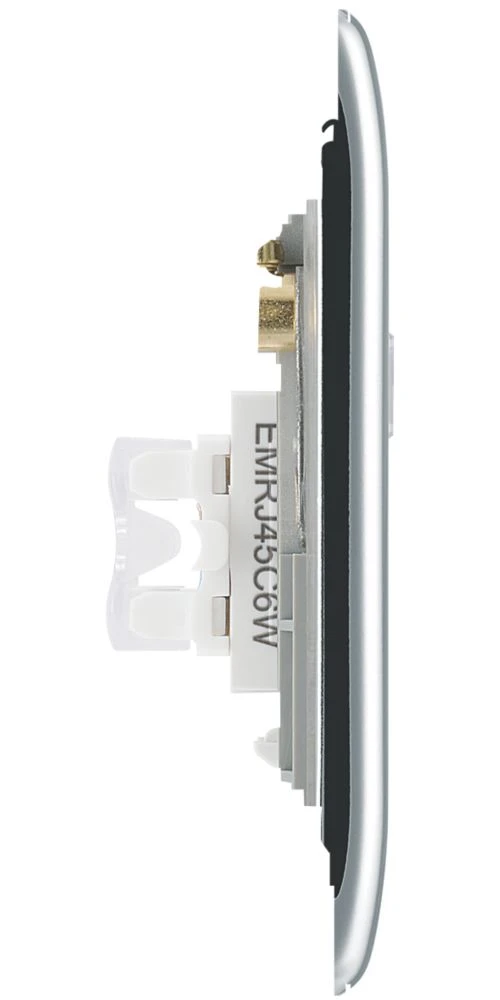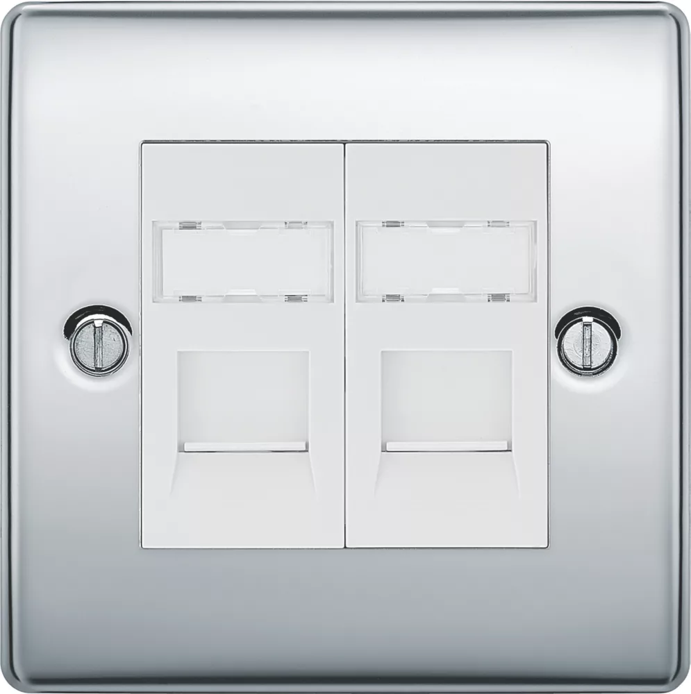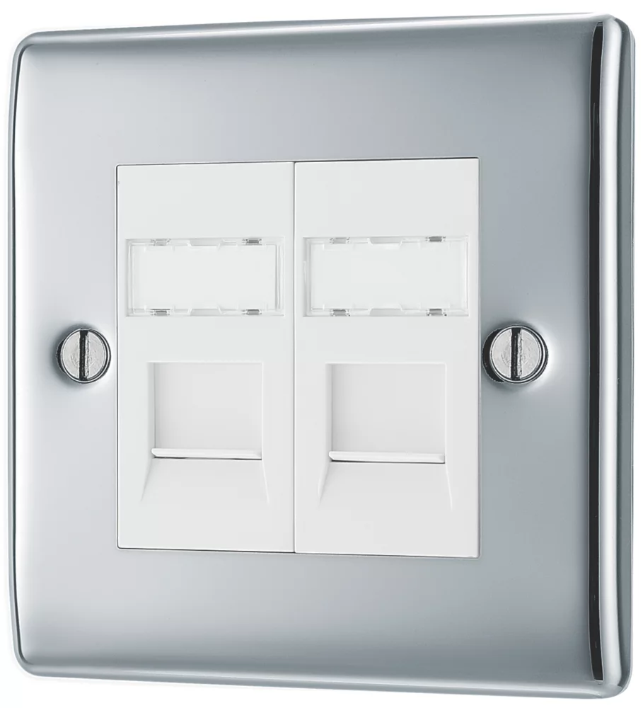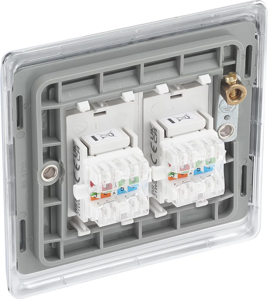 Uses an IDC terminal connection. Ideal for home and office, providing 2 networking outlets with ID window for identification. Features moisture control gasket to prevent tarnishing from new plaster. Finished with softly rounded edges for a sleek appearance.