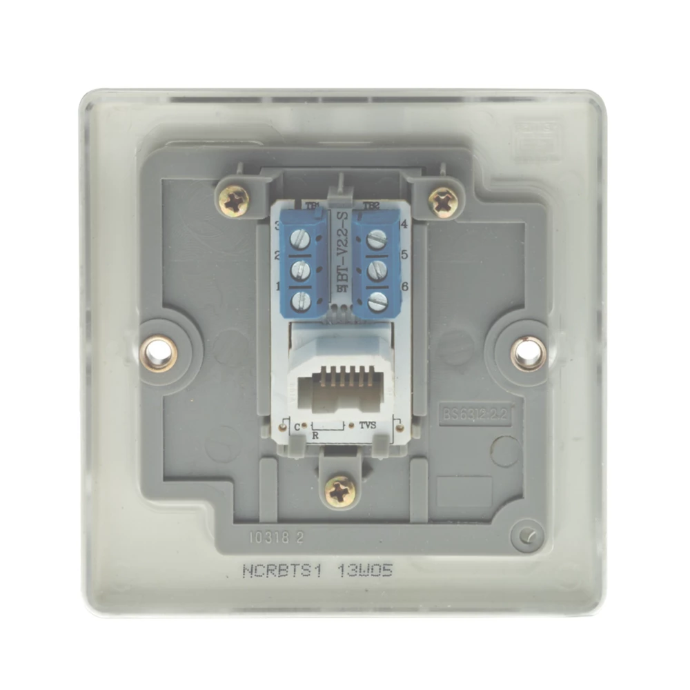 Slave socket with screw type connections for secondary and extension telephone sockets. Sleek and slim design with soft, rounded corners.