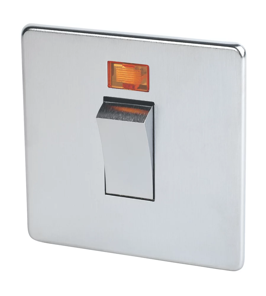 Control switch with a modern and contemporary design. Features interchangeable cover with concealed screws and positive drive switch action to prevent balancing between on and off positions. Brushed stainless steel finish.