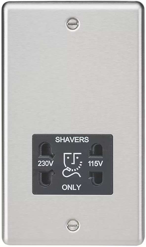 Raised, rounded-edge metal design dual voltage shaver socket. Ideal for bathroom upgrades.