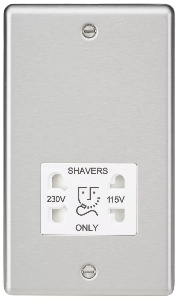 Raised, rounded-edge metal design dual voltage shaver socket. Ideal for bathroom upgrades.