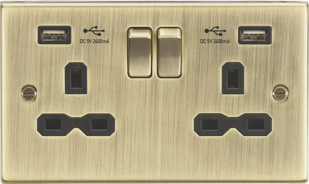 Decorative, raised square-edge design socket with matching metal rockers. Built-in dual USB charger.