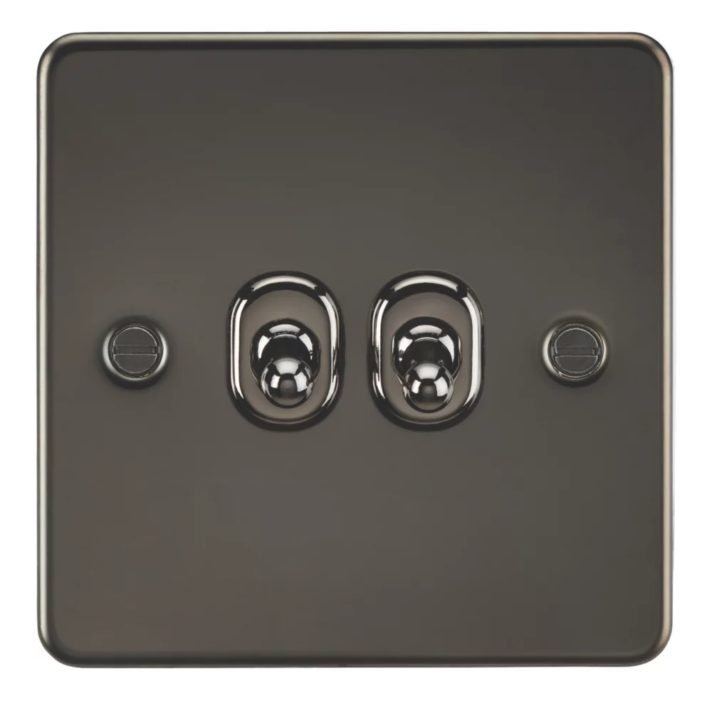 Raised, rounded-edge metal design with matching metal toggle switches.