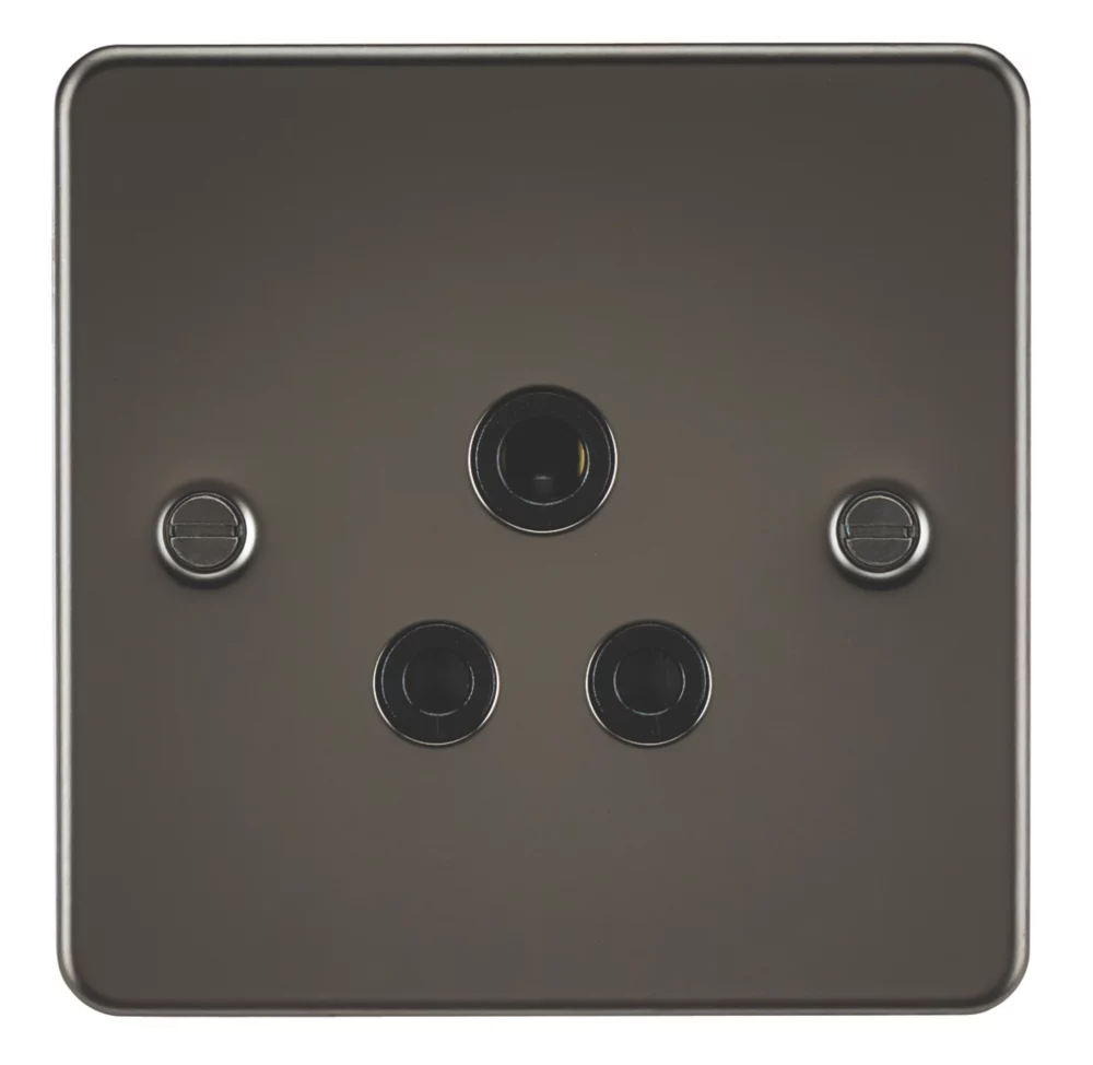 Round pin socket with built-in gasket. Flat plate, low profile metal design. Ideal for use in custom lighting solutions.
