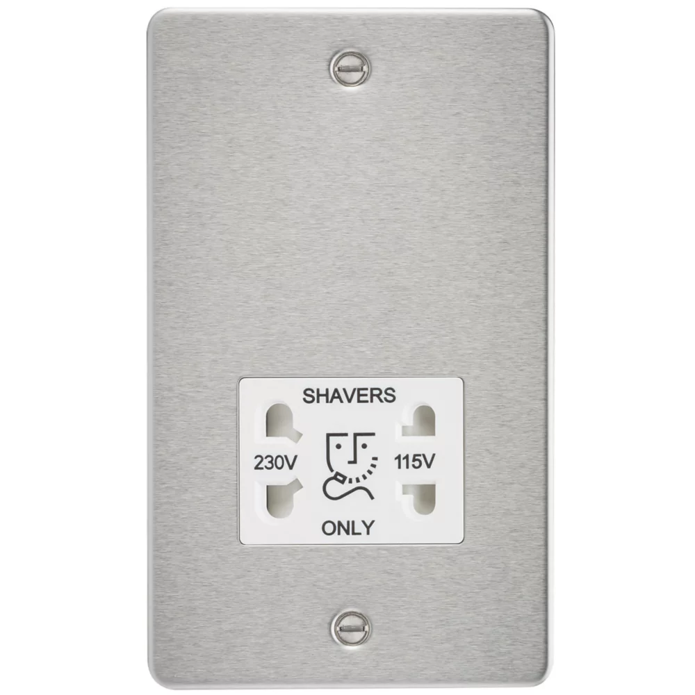Flat plate, low profile metal design dual voltage shaver socket. Ideal for bathroom upgrades.