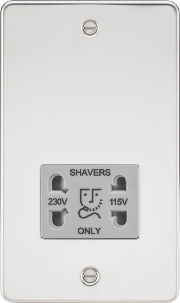 Flat plate, low profile metal design dual voltage shaver socket. Ideal for bathroom upgrades.