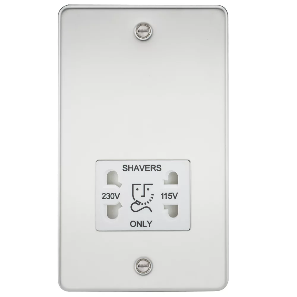 Flat plate, low profile metal design dual voltage shaver socket. Ideal for bathroom upgrades.