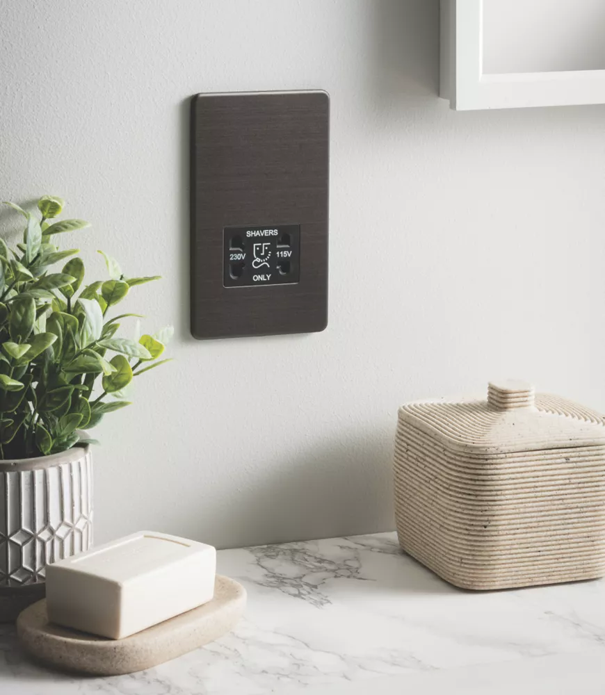 Screwless, flat plate, design dual voltage shaver socket. Ideal for bathroom upgrades.