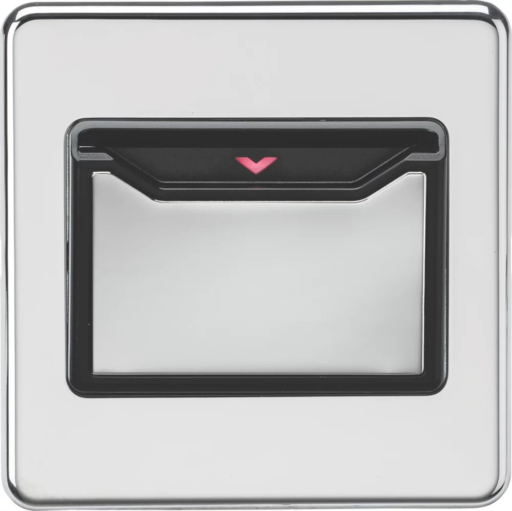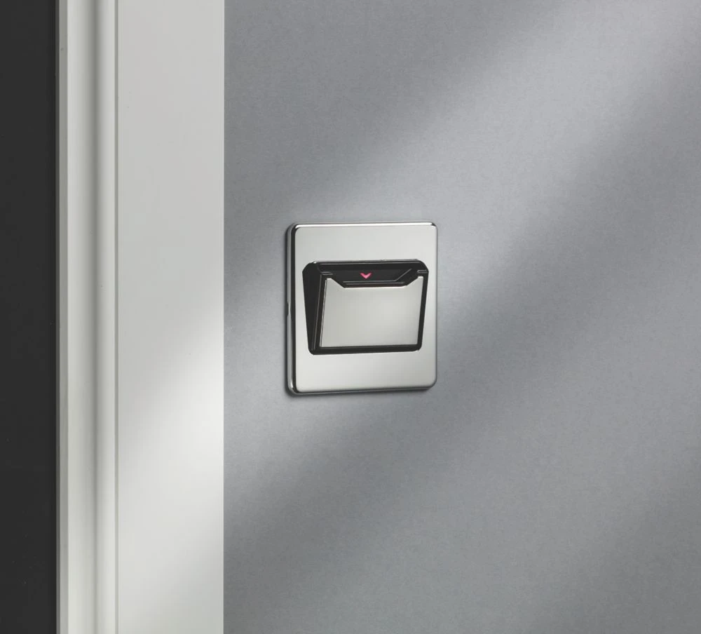 Screwless, low profile design with built in gasket. Ideal for activating power and lighting in hotel rooms via the room key-card. Power to the room is cut 30 seconds after withdrawal of the key-card. Features back-lit arrow to aid activation in dark rooms.