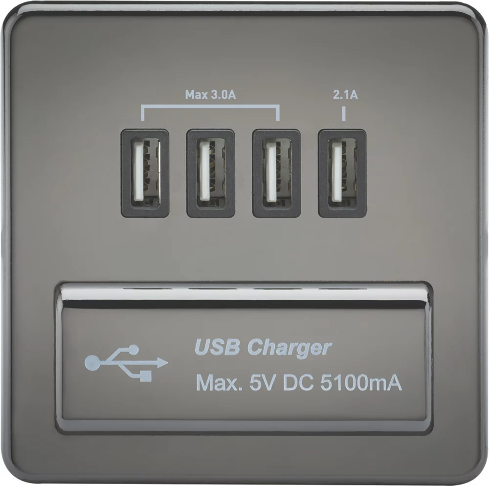 Low profile, metal-design Quad USB charger with dedicated 2.1A outlet for tablets. Ideal solution for places such as coffee shops, foyers, receptions and hotel rooms where there are multiple users.