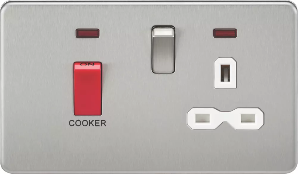 Screwless flat profile design, 45A cooker switch combined with a 13A socket, LED indicator and built-in gasket. Allows control of 2 or more cooking appliances providing rating is sufficient, and enables isolation of the unit for maintenance and repairs.