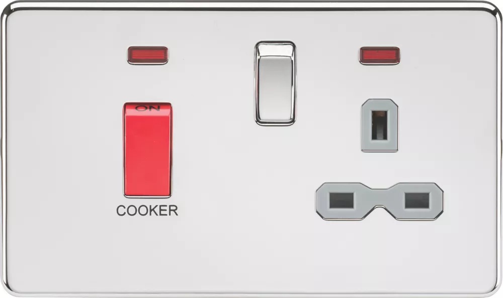 Screwless design, 45A control switch combined with a 13A socket, with built-in gasket and LED indicators. Allows control of 2 or more cooking appliances providing rating is sufficient, and enables isolation of the unit for maintenance and repairs.