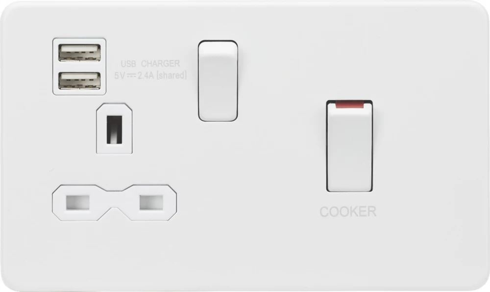 Screwless, flat profile design, 45A control switch combined with a 13A socket, 2 USB ports and built-in gasket. Allows control of 2 or more cooking appliances providing rating is sufficient, and enables isolation of the unit for maintenance and repairs.