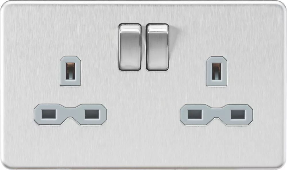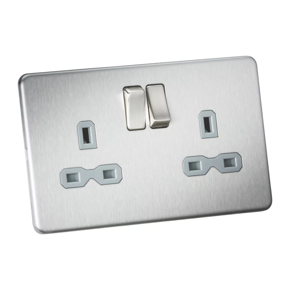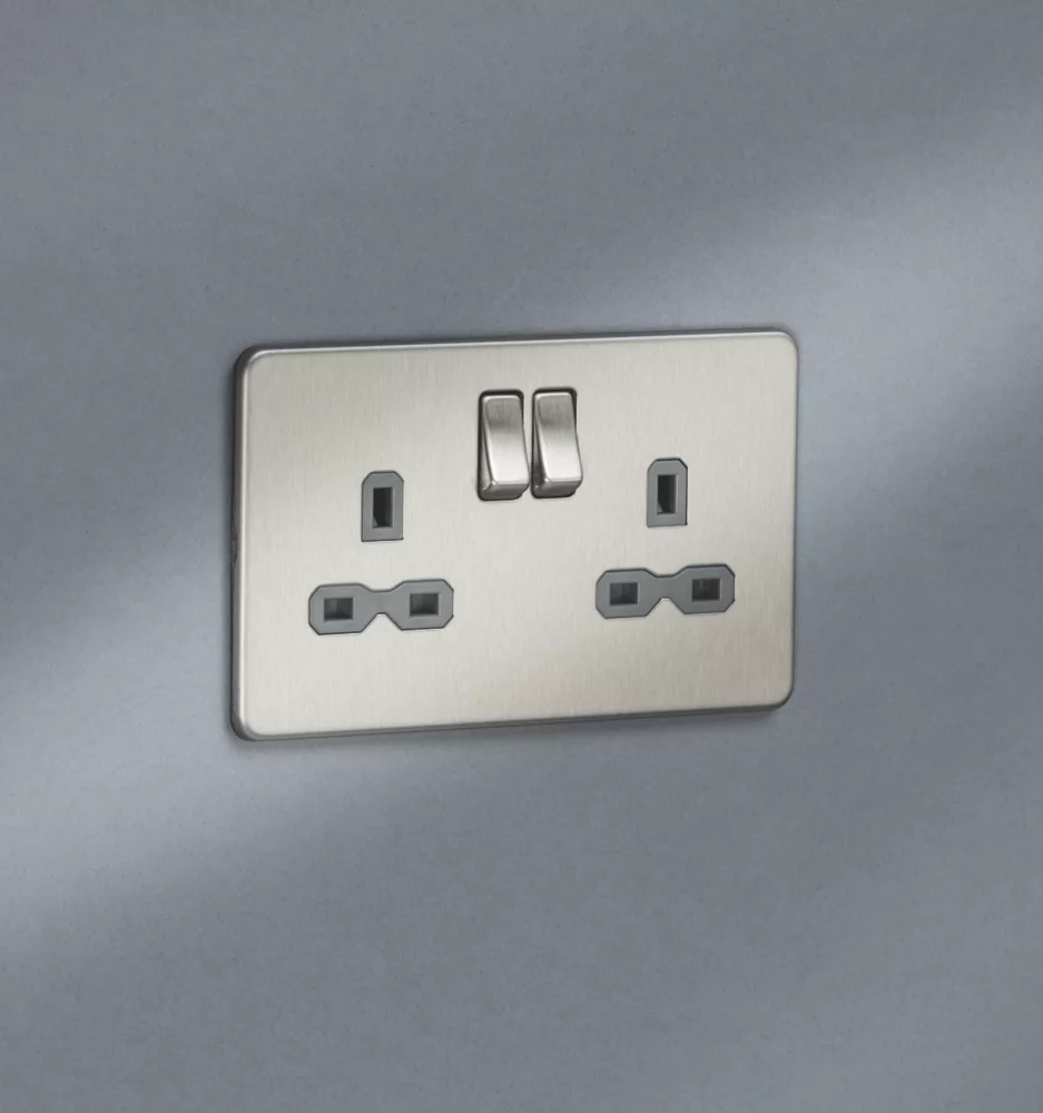 Screwless low profile design constructed from premium grade steel, with matching metal rockers. Socket inserts are completely hidden when plug is inserted. Built-in gasket.