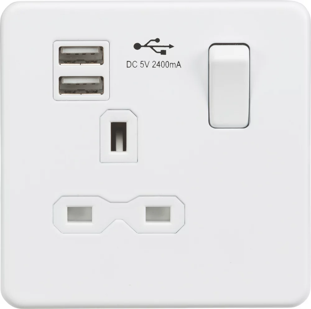 MK Base 13A 1-Gang DP Switched Socket + 2.4A 1-Outlet Type A USB Charger White With White Inserts