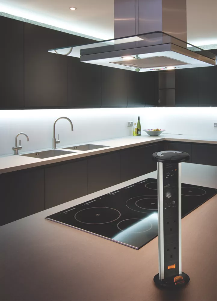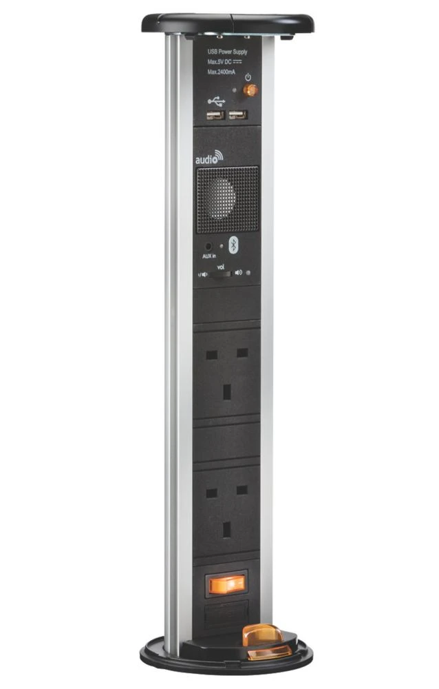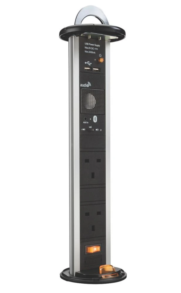 Switched pop-up socket with USB features Bluetooth speaker with volume control and headphone port, and 2 x 13A sockets with backlit on/off rocker at base. Secure clip locks the unit upright when in use and an innovative cable management cap and inverted socket allow unit to be used when closed. Ideal for use on kitchen counter tops, office desktops, boardrooms and hotel rooms.