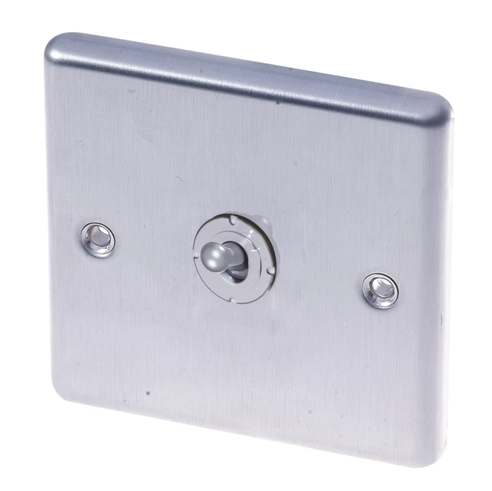 Stainless steel 1-gang toggle switch with integral moisture protection gasket.