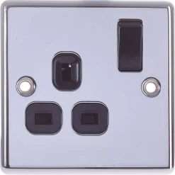 Twin earth, single pole sockets with in-line terminals and black inserts. Raised edge decorative power sockets to complement any interior decor.
