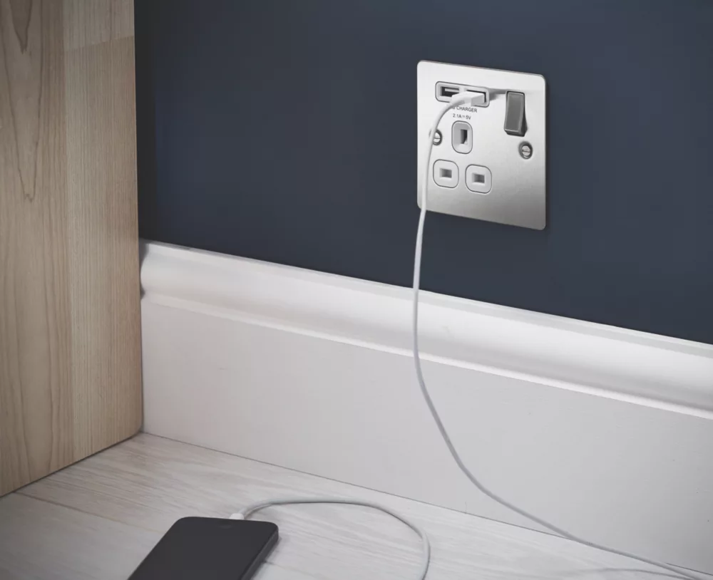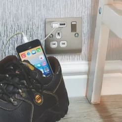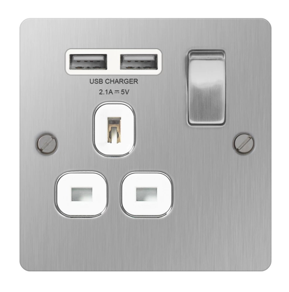 Minimal profile, decorative switched socket with 2 x USB charging ports. Features angled in-line terminals and includes backed out captive screws for easy installation. Ideal for charging iPad, iPhone, tablets, mobiles, cameras and more.