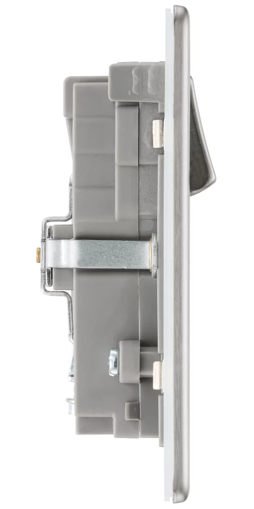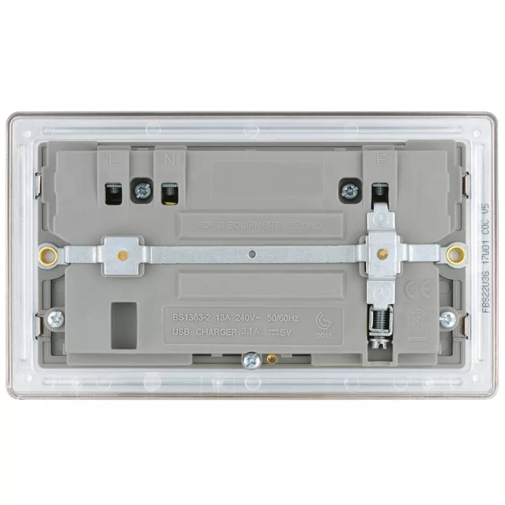 Easy to install, switched socket with USB charger. Removable, decorative screwless flat-plate and slim, clip-on profile. Supplied with 10mm spacer for fitting into a 25mm box. Ideal for redecoration projects.