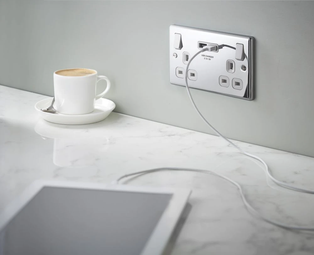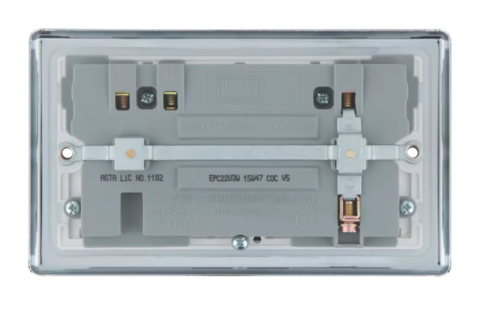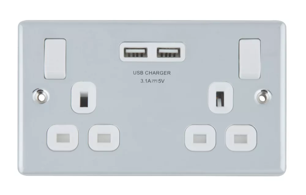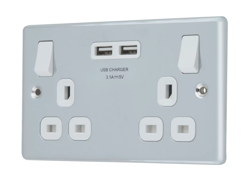 Decorative socket with 2 x USB charging ports. Ideal for charging iPads, iPhones, tablets, mobiles, cameras, MP3s and many more devices. Features angled, in-line terminals and includes backed out captive screws for easy installation.