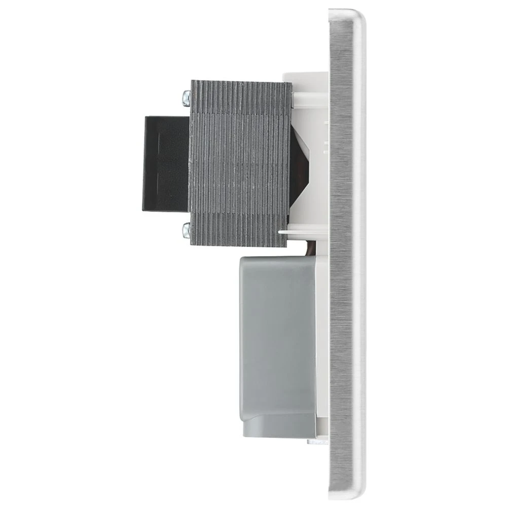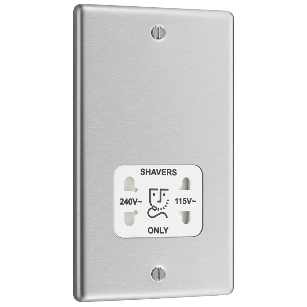 Stainless steel shaver socket with white insert, integral moisture protection gasket.