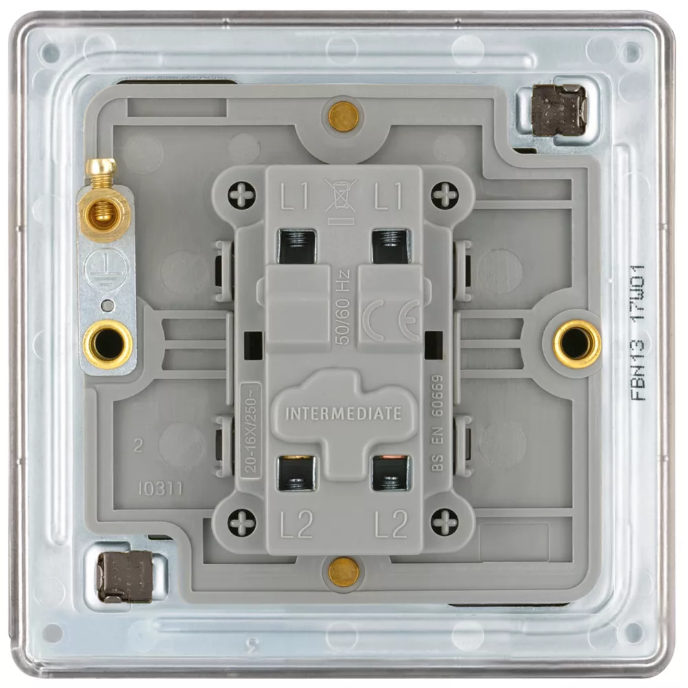 Intermediate switch with decorative, removable screwless flat-plate. Slim, clip-on profile to complement any interior decor. Ideal for redecoration projects.